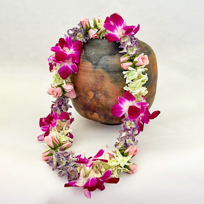 Translated, Uilani means "heavenly beauty" or "royal beauty". Hand sewn using purple orchids, white and lavender crown flower and red roses. Truly spectacular!
